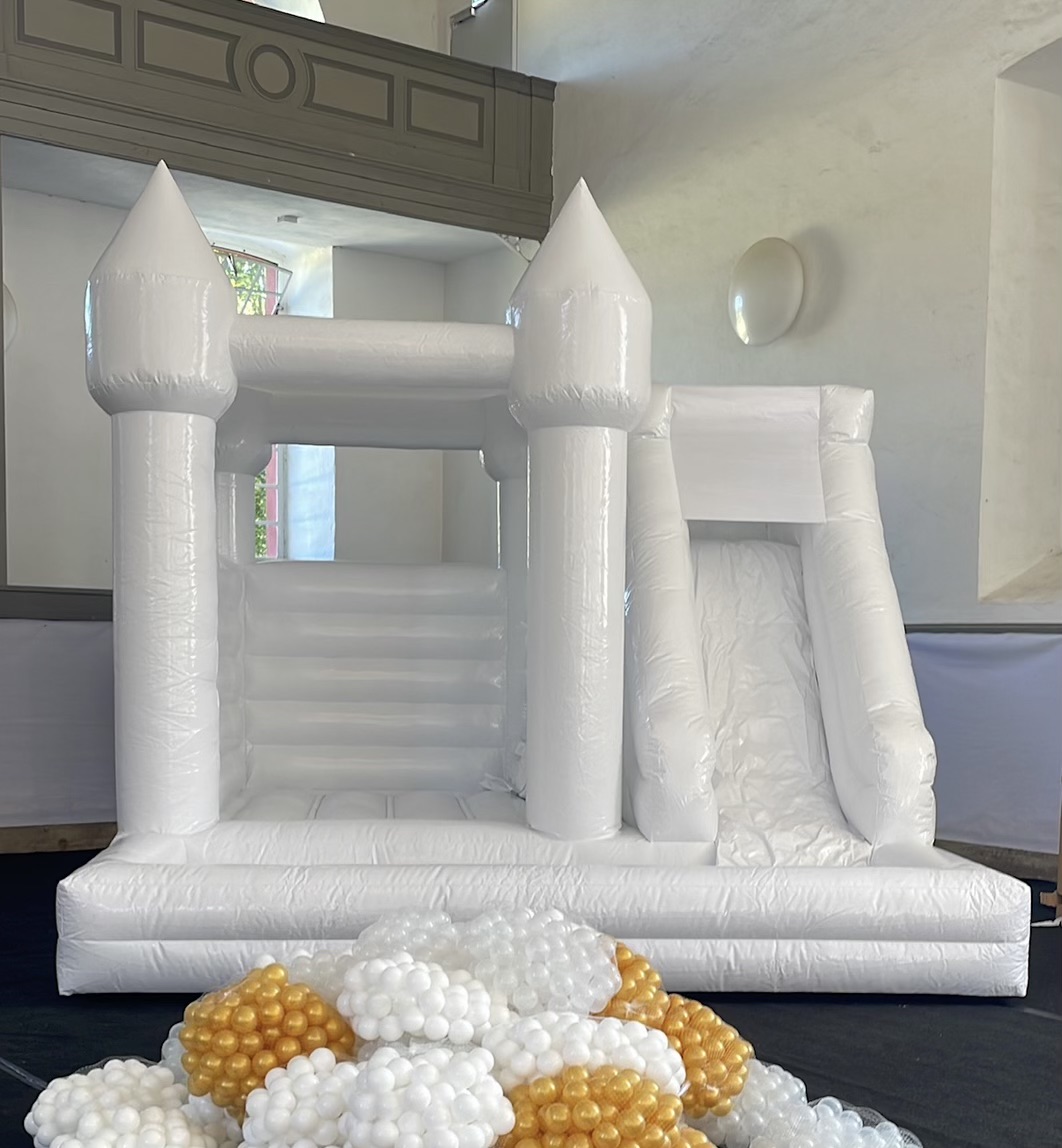 Sie suchen eine weiße Hochzeit Hüpfburg? Unsere weiße Hüpfburg hat neben einer großen Springfläche außerdem eine Rutsche und ein großes Bällebad mit goldenen und weißen Bällen. So schmiegt sich die Hüpfburg nicht nur perfekt in jede Location ein, sondern lässt es Ihren kleineren Gästen nicht langweilig werden.